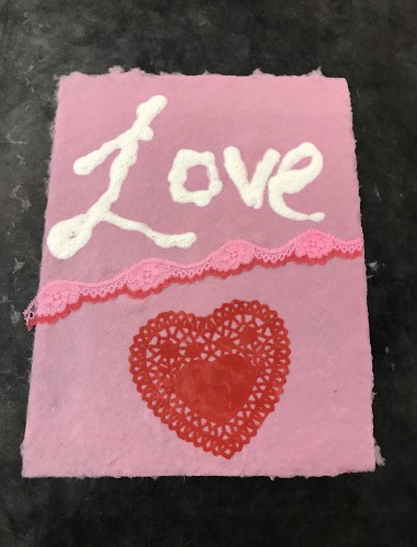 I discovered that making paper is extremely wet—but easy. Once the paper was placed on the felt and before it was pressed, I was free to decorate it with a plethora of supplied materials, including fabric, lace and paper hearts, and to add personal messages of love, inspiration and support. As I embellished my valentines, I could feel the love in the room and was overwhelmed by the creativity of my fellow papermakers.