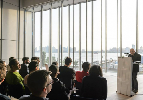 Orlando Ferrand reading in front of the Hudson River view for Metaphors & Their DistemperCourtesy the Whitney Museum of American Art