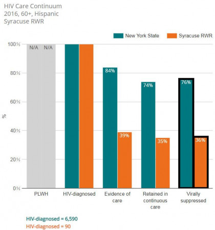 - Notable, geographic and demographic disparities in VLS are apparent. For example, among Hispanics who were 60+ years, the statewide proportion for viral suppression was 76%, compared with only 36% in the Syracuse Ryan White Region.