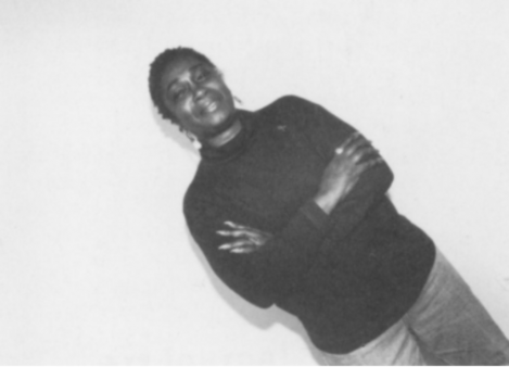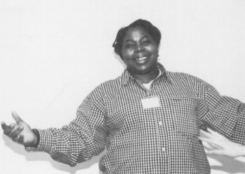 A black and white self-portrait of Linda, a Black woman artist, shot with her hands wide open, joyfully. She has short black curly hair, and is wearing a plaid long-sleeve shirt. Linda has a bright, big smile with kind eyes.Courtesy of Visual AIDS/Linda Ellis with Ann Meredith, Self Portrait, 1996, Black and white photograph, 16” x 20” Source: Arts Communities/ AIDS Communities: Realizing the Archive Project