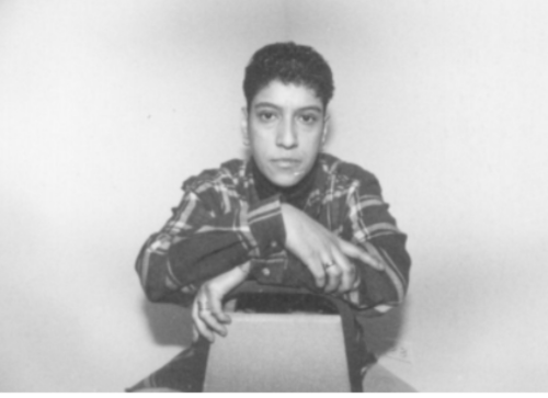 A black and white self-portrait of Alma, a femme non-binary artist with faded, short curly hair wearing a plaid long-sleeve shirt with their gaze fixed directly towards the camera with a stoic attitude, and their arms crossed in front of them resting on aCourtesy of Visual AIDS/Alma “Maritza” Cortes with Ann Meredith, Self Portrait, 1996, Black and white photograph, 16” x 20” Source: Arts Communities/AIDS Communities: Realizing the Archive Project
