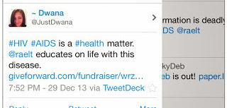 This is what happen. Dwana tweeted about the GiveForwad Life Fund she organized on my behalf. Then someone tweeted to me and Dwana that HIV/AIDS has practically been eradicated. My gut reaction was a curse deep within but I let the moment pass and this morning I tweeted in response to her misinformation and I didn’t curse!