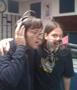 Tonight I had band practice with Synthetic Division- the set is really coming together. After practice, Marshall the keyman and I lit a firecracker in drummer Mike’s driveway, then went to WNRN’s Subculture Shock radio show to talk about the event this weekend. That’s me and Silent Muse (who are also playing) band member Chad. I was pretending to sing “We Are The World”.