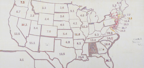 “Finding Barry,” Mark Bradford (2015). Numbers represent the estimated adults and adolescents diagnosed with AIDS (per 100,000) in each U.S. state in 2009.Courtesy the artist and Hauser & Wirth. Photo by Joshua White.