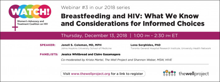 Who: The Well Project’s Krista Martel, Lena Serghides, PhD, Jenell Coleman, MD, MPH, HIVE’s Shannon Weber, MSW. Also joining are two women living with HIV, Claire Gasamagera and Jessica Whitbread, who will share their personal experiences with breastfeeding while positive.