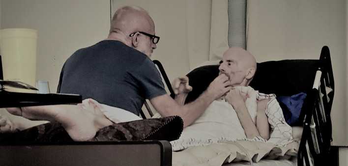 There is a hospital bed in the one-bedroom apartment Tim and Timothy share. Timothy is bedridden, and is receiving home hospice care. Tim divides his time between caring for Timothy and fielding calls from concerned friends as well as from various researchers to whom Timothy has generously provided endless blood and tissue samples over the years.