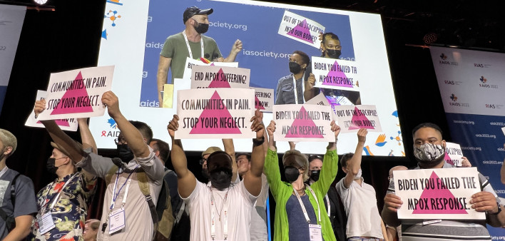 There was something more than the typical passion on display when activists stormed the plenary stage at AIDS2022 today to protest the slow monkeypox response by United States public health officials. The cries of the diverse crowd of protestors were urgent and inflammatory. Their demands felt deeply personal.