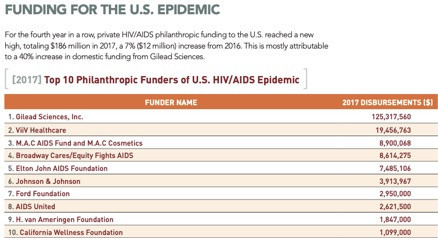Here are the top 10 funders of the US HIV/AIDS epidemic. Eighty percent of the domestic HIV funding comes from the pharmaceutical industry.